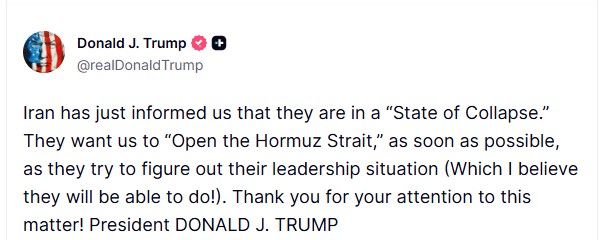 دونالد ترامپ در پیامی در شبکه اجتماعی «تروث سوشال» اعلام کرد: «ایران به‌تازگی به ما اطلاع داده که در وضعیت فروپاشی قرار دارد. آن‌ها از ما می‌خواهند تنگه هرمز را هرچه سریع‌تر باز کنیم، در حالی که تلاش می‌کنند وضعیت رهبری خود را مشخص کنند (که به نظر من موفق خواهند شد!).» این اظهارات در حالی بیان می‌شود که هیچ‌گونه توضیح رسمی درباره کانال یا محتوای این ارتباط ارائه نشده است.